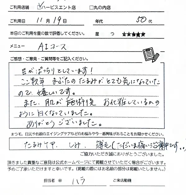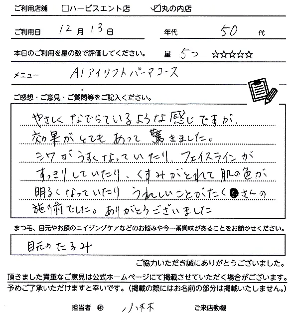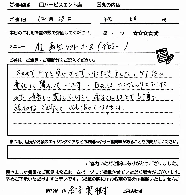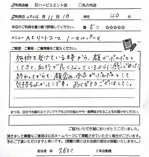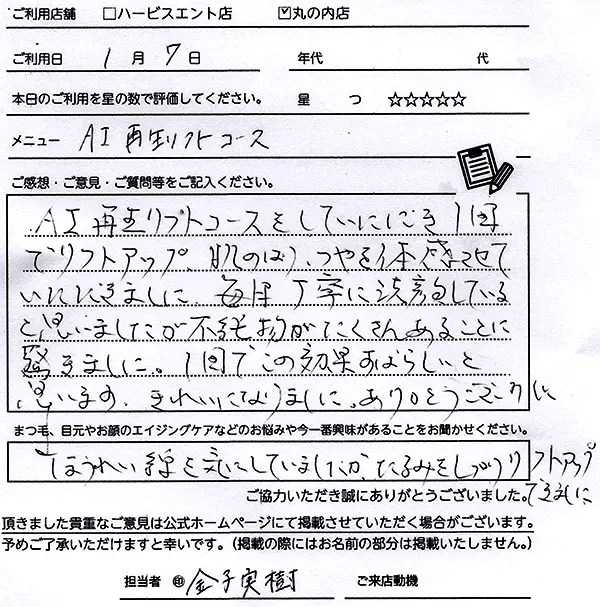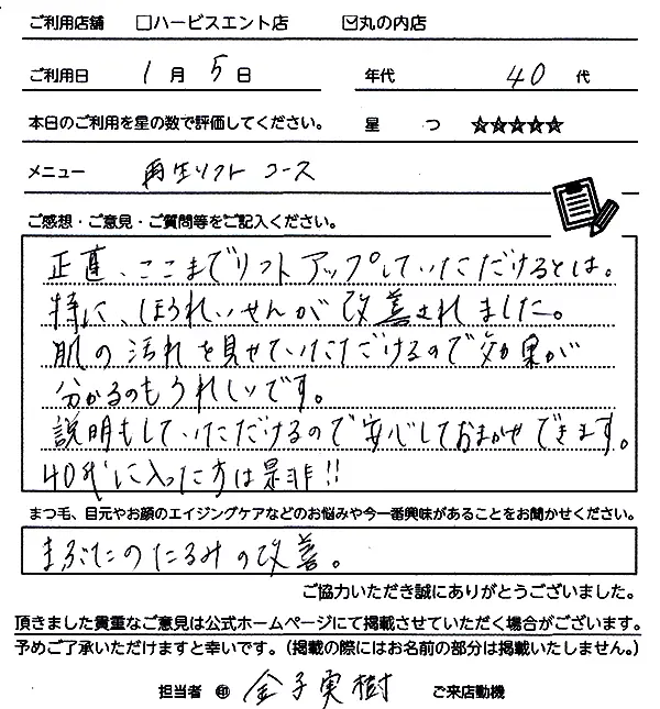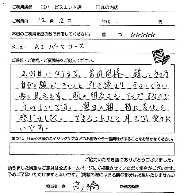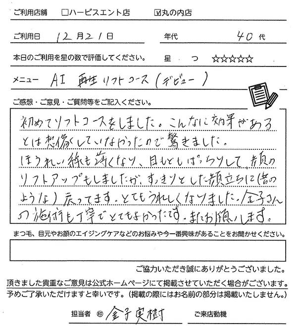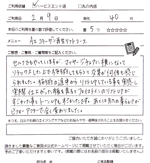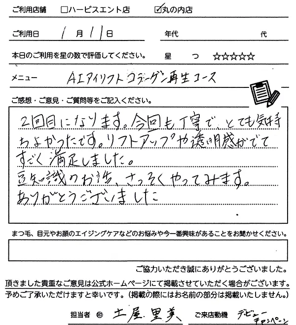 2回目になります。今回も丁寧で、とても気持ちよかったです。リフトアップや透明感がでて、すごく満足しました。