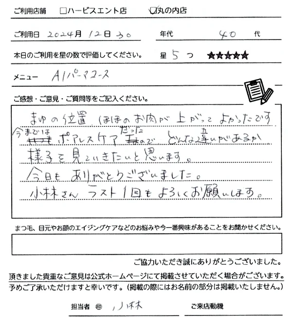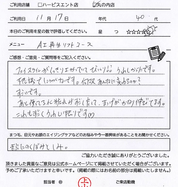 こちらのコースは、はじめてでしたが、仕上がり時からリフトアップ効果を感じられて驚きました。まつげパーマと同時に施術いただけるので、より変化を実感できるような気がします。続けての変化も楽しみです。ありがとうございました。