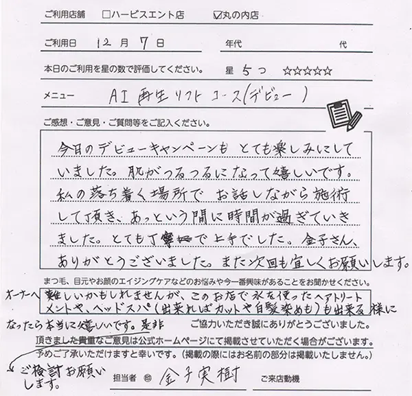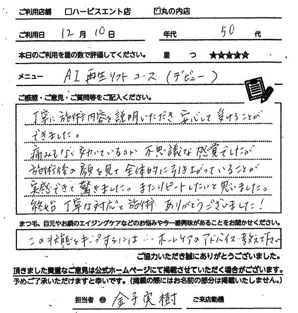 金子さんの施術も丁寧でとてもよかったです。またお願いします。