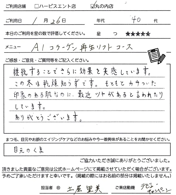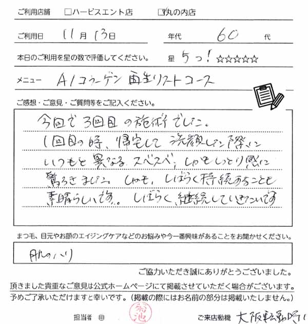 今回で3回目の施術でした。1回目の時、帰宅して洗顔した際にいつも異なるスベスベ、しかもしっとり感に驚きました。しかも、しばらく持続すもことも素晴らしいです。しばらく継続していきたいです。