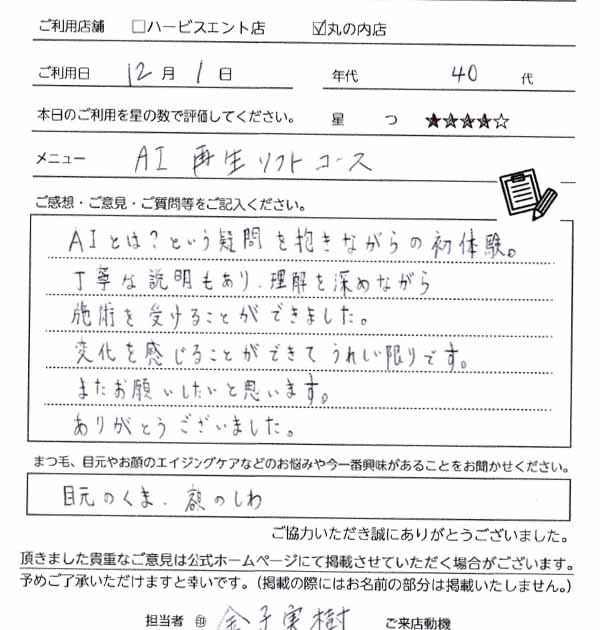 AIとは?という疑問を抱きながらの初体験、丁寧な説明もあり、理解を深めながら施術を受けることができました。変化を感じることができてうれしい限りです。またお願いしたいと思います。