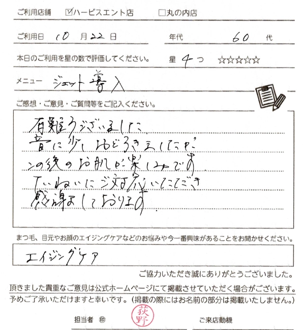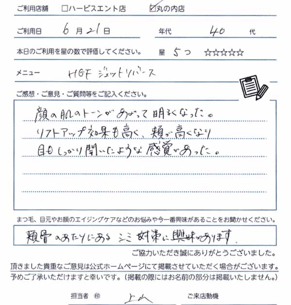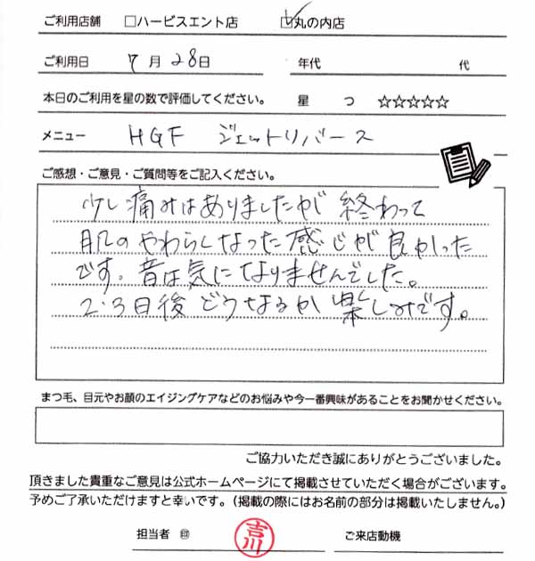 フェイシャルケアは初めてでしたが、HGFの効果や内容を伺い、ぜひやってみたいと感じ施術して頂きました。