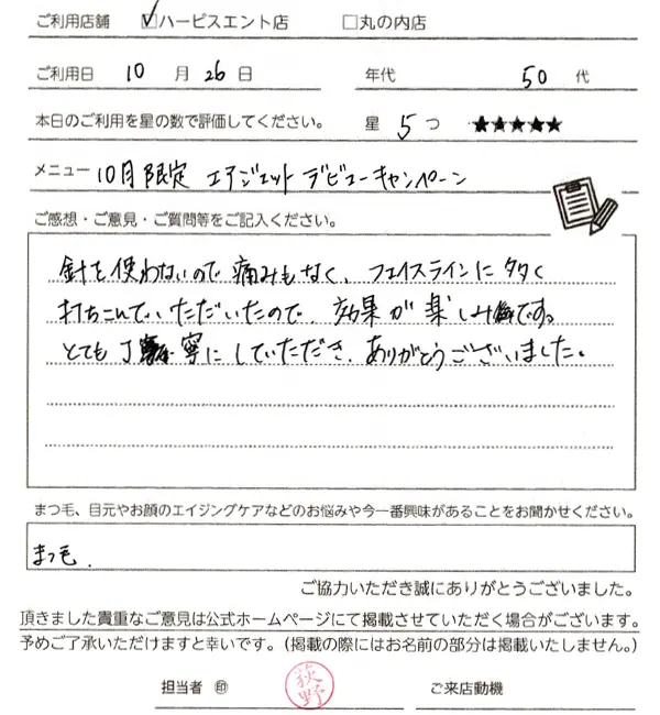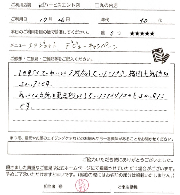 事前のご説明もしっかりいただいたので、安心してためすことができました。施術後のお化粧可もいいですね。