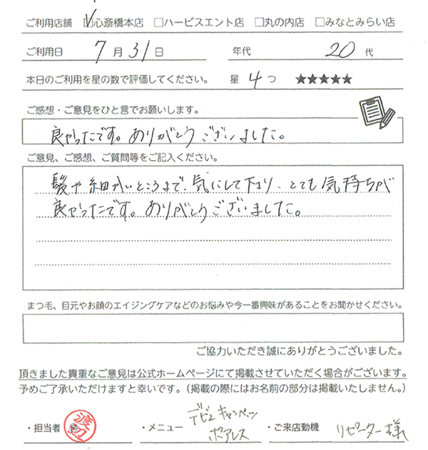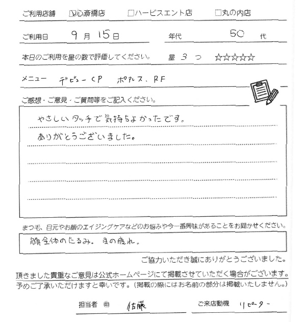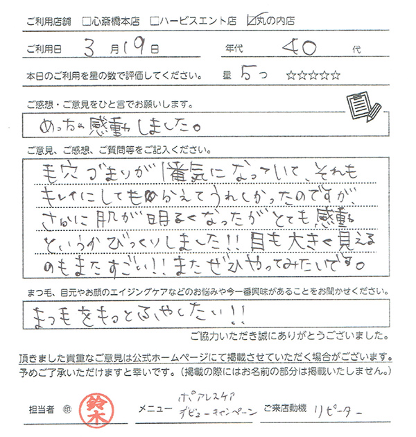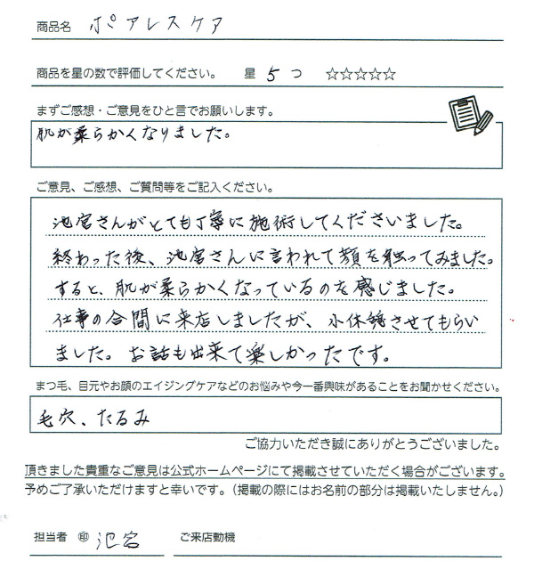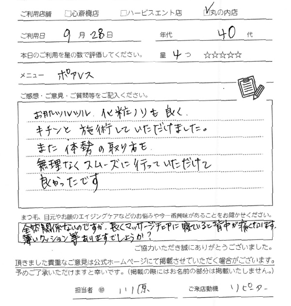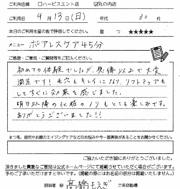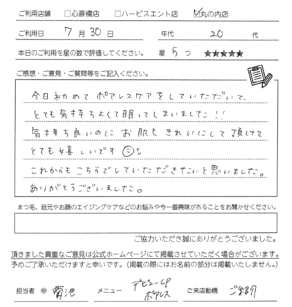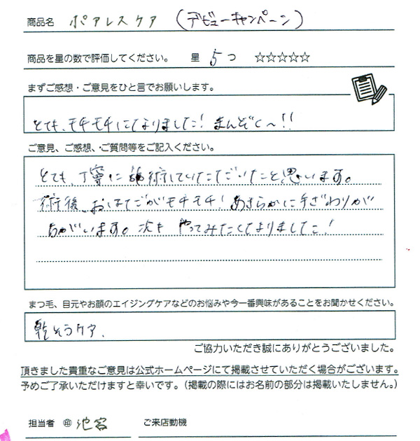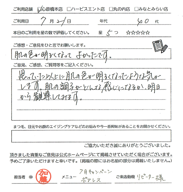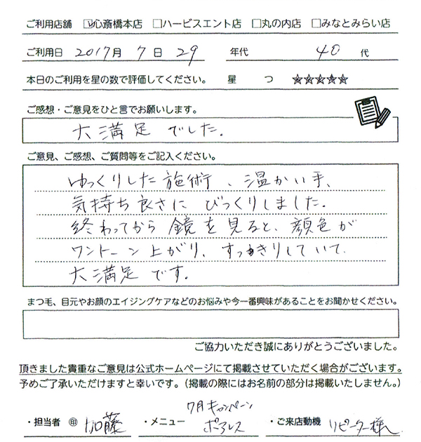 顔のケアは初めてでしたが明らかにbefore afterを実感しています。ご丁寧な施術をありがとうございました。