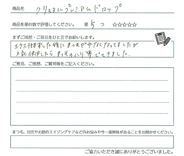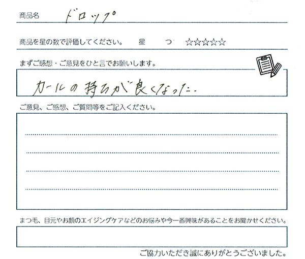 プレミアムドロップは、使用しだしてから、抜け毛・乾燥などまつ毛のトラブルがなくなりました。